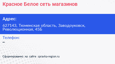 Красное & Белое, сеть магазинов по адресу 627143, Тюменская область, Заводоуковск, Революционная, 45Б в дальнейшем Организация, размещена в следующих категориях: