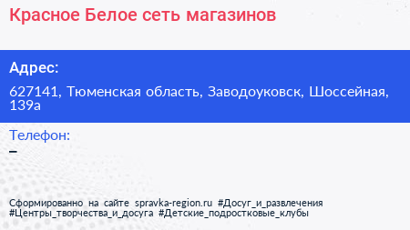 Красное & Белое, сеть магазинов по адресу 627141, Тюменская область, Заводоуковск, Шоссейная, 139а в дальнейшем Организация, размещена в следующих категориях: