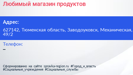 Любимый, магазин продуктов по адресу 627142, Тюменская область, Заводоуковск, Механическая, 49/2 в дальнейшем Организация, размещена в следующих категориях: