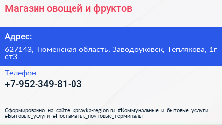Магазин овощей и фруктов по адресу 627143, Тюменская область, Заводоуковск, Теплякова, 1г ст3 в дальнейшем Организация, размещена в следующих категориях: