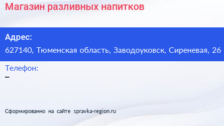 Магазин разливных напитков по адресу 627140, Тюменская область, Заводоуковск, Сиреневая, 26 в дальнейшем Организация, размещена в следующих категориях: