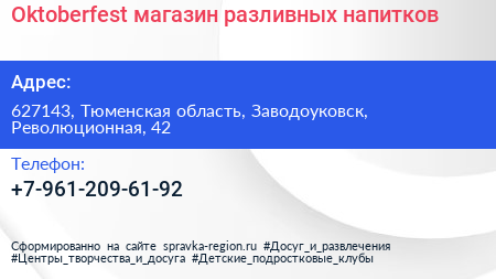 Oktoberfest, магазин разливных напитков по адресу 627143, Тюменская область, Заводоуковск, Революционная, 42 в дальнейшем Организация, размещена в следующих категориях: