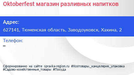 Oktoberfest, магазин разливных напитков по адресу 627141, Тюменская область, Заводоуковск, Хахина, 2 в дальнейшем Организация, размещена в следующих категориях: