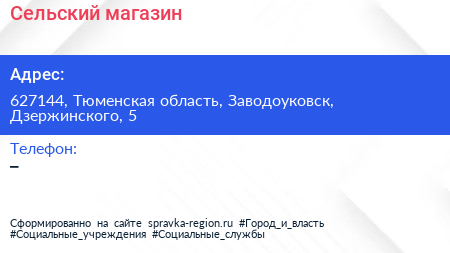 Сельский, магазин по адресу 627144, Тюменская область, Заводоуковск, Дзержинского, 5 в дальнейшем Организация, размещена в следующих категориях: