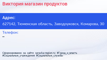 Виктория, магазин продуктов по адресу 627142, Тюменская область, Заводоуковск, Комарова, 30 в дальнейшем Организация, размещена в следующих категориях: