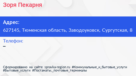 Зоря, Пекарня по адресу 627145, Тюменская область, Заводоуковск, Сургутская, 8 в дальнейшем Организация, размещена в следующих категориях: