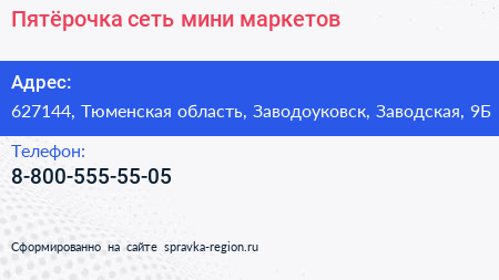 Пятёрочка, сеть мини-маркетов по адресу 627144, Тюменская область, Заводоуковск, Заводская, 9Б в дальнейшем Организация, размещена в следующих категориях: