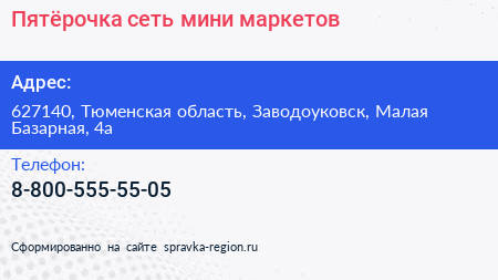 Пятёрочка, сеть мини-маркетов по адресу 627140, Тюменская область, Заводоуковск, Малая Базарная, 4а в дальнейшем Организация, размещена в следующих категориях: