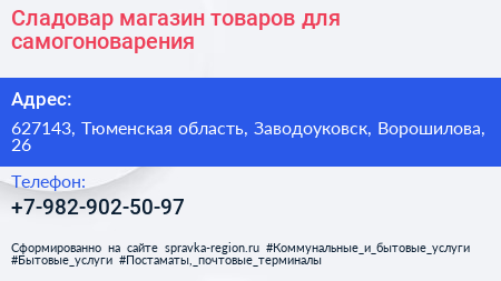 Сладовар, магазин товаров для самогоноварения по адресу 627143, Тюменская область, Заводоуковск, Ворошилова, 26 в дальнейшем Организация, размещена в следующих категориях: