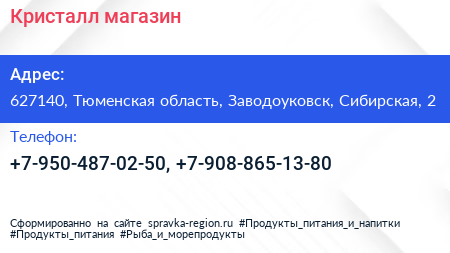 Кристалл, магазин по адресу 627140, Тюменская область, Заводоуковск, Сибирская, 2 в дальнейшем Организация, размещена в следующих категориях: