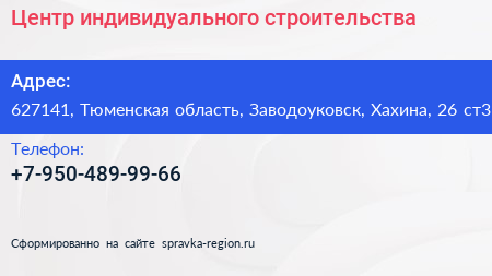 Центр индивидуального строительства по адресу 627141, Тюменская область, Заводоуковск, Хахина, 26 ст3 в дальнейшем Организация, размещена в следующих категориях: