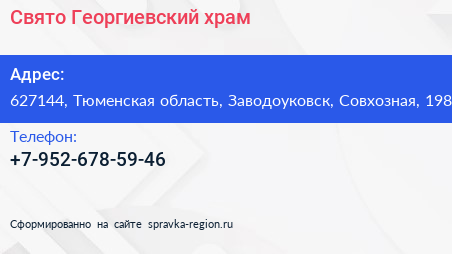 Свято-Георгиевский храм по адресу 627144, Тюменская область, Заводоуковск, Совхозная, 198 в дальнейшем Организация, размещена в следующих категориях: