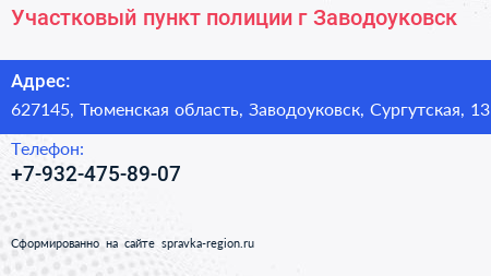 Участковый пункт полиции, г. Заводоуковск по адресу 627145, Тюменская область, Заводоуковск, Сургутская, 13 в дальнейшем Организация, размещена в следующих категориях: