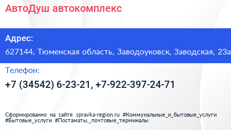 АвтоДуш, автокомплекс по адресу 627144, Тюменская область, Заводоуковск, Заводская, 23а в дальнейшем Организация, размещена в следующих категориях: