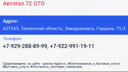 Автогаз 72, СТО по адресу 627143, Тюменская область, Заводоуковск, Герцена, 71/1 в дальнейшем Организация, размещена в следующих категориях: