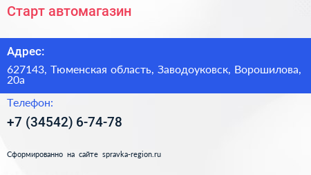 Старт, автомагазин по адресу 627143, Тюменская область, Заводоуковск, Ворошилова, 20а в дальнейшем Организация, размещена в следующих категориях: