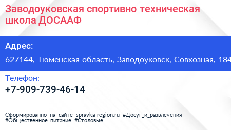 Заводоуковская спортивно-техническая школа, ДОСААФ по адресу 627144, Тюменская область, Заводоуковск, Совхозная, 184 в дальнейшем Организация, размещена в следующих категориях: