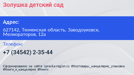 Золушка, детский сад по адресу 627142, Тюменская область, Заводоуковск, Мелиораторов, 12а в дальнейшем Организация, размещена в следующих категориях: