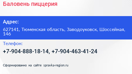 Баловень, пиццерия по адресу 627141, Тюменская область, Заводоуковск, Шоссейная, 146 в дальнейшем Организация, размещена в следующих категориях: