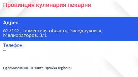 Провинция, кулинария-пекарня по адресу 627142, Тюменская область, Заводоуковск, Мелиораторов, 3/1 в дальнейшем Организация, размещена в следующих категориях: