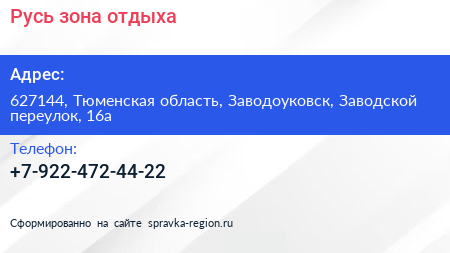 Русь, зона отдыха по адресу 627144, Тюменская область, Заводоуковск, Заводской переулок, 16а в дальнейшем Организация, размещена в следующих категориях: