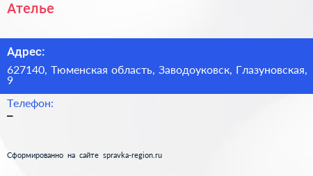 Ателье по адресу 627140, Тюменская область, Заводоуковск, Глазуновская, 9 в дальнейшем Организация, размещена в следующих категориях: