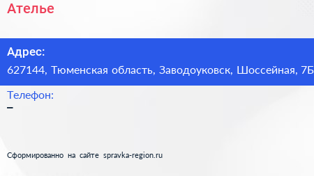 Ателье по адресу 627144, Тюменская область, Заводоуковск, Шоссейная, 7Б в дальнейшем Организация, размещена в следующих категориях: