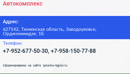 Автокомплекс по адресу 627142, Тюменская область, Заводоуковск, Орджоникидзе, 1Б в дальнейшем Организация, размещена в следующих категориях: