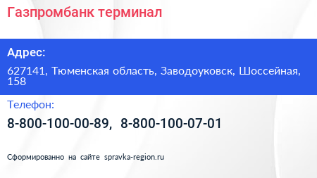 Газпромбанк, терминал по адресу 627141, Тюменская область, Заводоуковск, Шоссейная, 158 в дальнейшем Организация, размещена в следующих категориях: