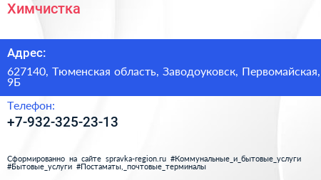 Химчистка по адресу 627140, Тюменская область, Заводоуковск, Первомайская, 9Б в дальнейшем Организация, размещена в следующих категориях:
