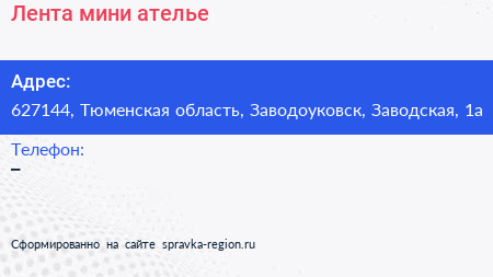 Лента, мини-ателье по адресу 627144, Тюменская область, Заводоуковск, Заводская, 1а в дальнейшем Организация, размещена в следующих категориях: