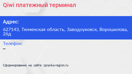 Qiwi, платежный терминал по адресу 627143, Тюменская область, Заводоуковск, Ворошилова, 26д в дальнейшем Организация, размещена в следующих категориях: