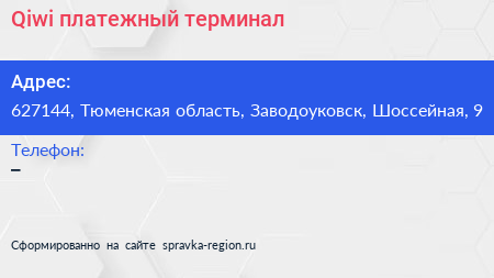 Qiwi, платежный терминал по адресу 627144, Тюменская область, Заводоуковск, Шоссейная, 9 в дальнейшем Организация, размещена в следующих категориях: