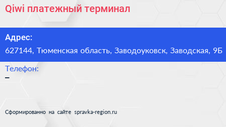 Qiwi, платежный терминал по адресу 627144, Тюменская область, Заводоуковск, Заводская, 9Б в дальнейшем Организация, размещена в следующих категориях: