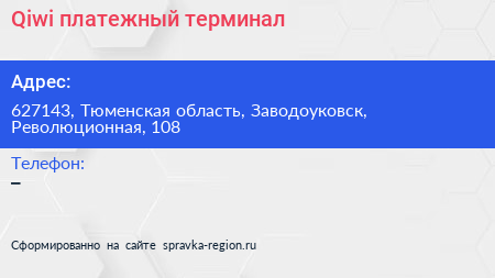 Qiwi, платежный терминал по адресу 627143, Тюменская область, Заводоуковск, Революционная, 108 в дальнейшем Организация, размещена в следующих категориях: