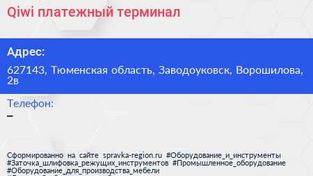 Qiwi, платежный терминал по адресу 627143, Тюменская область, Заводоуковск, Ворошилова, 2в в дальнейшем Организация, размещена в следующих категориях: