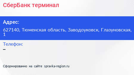 СберБанк, терминал по адресу 627140, Тюменская область, Заводоуковск, Глазуновская, 1 в дальнейшем Организация, размещена в следующих категориях: