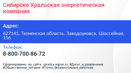 Сибирско-Уральская энергетическая компания по адресу 627141, Тюменская область, Заводоуковск, Шоссейная, 156 в дальнейшем Организация, размещена в следующих категориях: