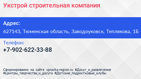 Укстрой, строительная компания по адресу 627143, Тюменская область, Заводоуковск, Теплякова, 1Б в дальнейшем Организация, размещена в следующих категориях: