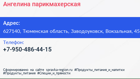 Ангелина, парикмахерская по адресу 627140, Тюменская область, Заводоуковск, Вокзальная, 45 в дальнейшем Организация, размещена в следующих категориях: