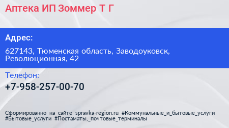 Аптека, ИП Зоммер Т.Г. по адресу 627143, Тюменская область, Заводоуковск, Революционная, 42 в дальнейшем Организация, размещена в следующих категориях: