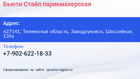 Бьюти Стайл, парикмахерская по адресу 627141, Тюменская область, Заводоуковск, Шоссейная, 139а в дальнейшем Организация, размещена в следующих категориях:
