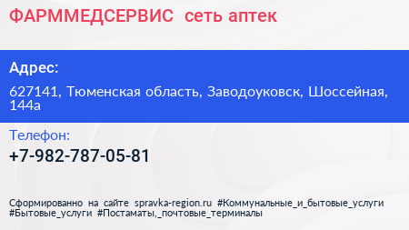 ФАРММЕДСЕРВИС+, сеть аптек по адресу 627141, Тюменская область, Заводоуковск, Шоссейная, 144а в дальнейшем Организация, размещена в следующих категориях: