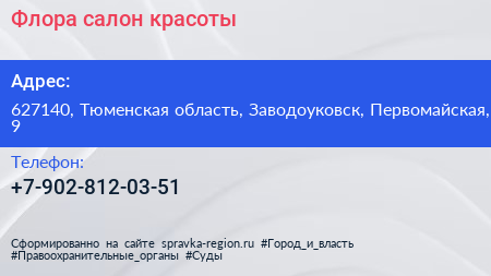 Флора, салон красоты по адресу 627140, Тюменская область, Заводоуковск, Первомайская, 9 в дальнейшем Организация, размещена в следующих категориях:
