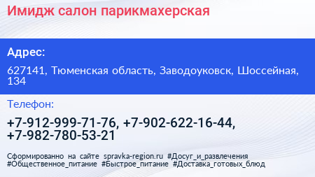 Имидж, салон-парикмахерская по адресу 627141, Тюменская область, Заводоуковск, Шоссейная, 134 в дальнейшем Организация, размещена в следующих категориях: