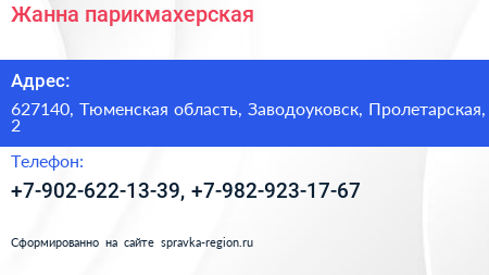 Жанна, парикмахерская по адресу 627140, Тюменская область, Заводоуковск, Пролетарская, 2 в дальнейшем Организация, размещена в следующих категориях:
