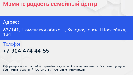 Мамина радость, семейный центр по адресу 627141, Тюменская область, Заводоуковск, Шоссейная, 134 в дальнейшем Организация, размещена в следующих категориях: