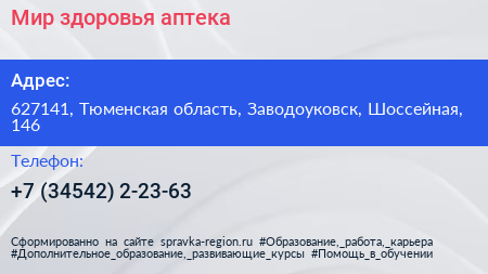 Мир здоровья, аптека по адресу 627141, Тюменская область, Заводоуковск, Шоссейная, 146 в дальнейшем Организация, размещена в следующих категориях: