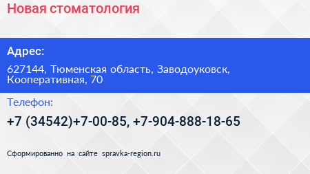 Новая стоматология по адресу 627144, Тюменская область, Заводоуковск, Кооперативная, 70 в дальнейшем Организация, размещена в следующих категориях: