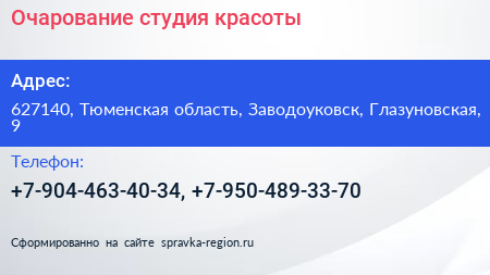 Очарование, студия красоты по адресу 627140, Тюменская область, Заводоуковск, Глазуновская, 9 в дальнейшем Организация, размещена в следующих категориях: